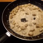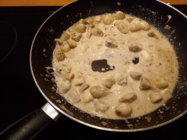 Laat de champignons zachtjes bakken en voeg de kalfsfond en de crème fraîche toe. Voeg de nootmuskaat toe en zet de warmtebron laag.