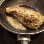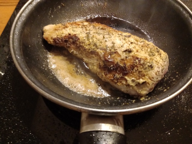 Verhit in een andere koekenpan 1 el. boter en 2 el olie. Braad de varkenshaas aan alle zijden aan. Voeg wat zout en peper toe. Doe een deksel op de pan en laat ongeveer 10 minuten zachtjes bakken. Haal de varkenshaas uit de pan en dek deze af met aluminiumfolie.