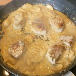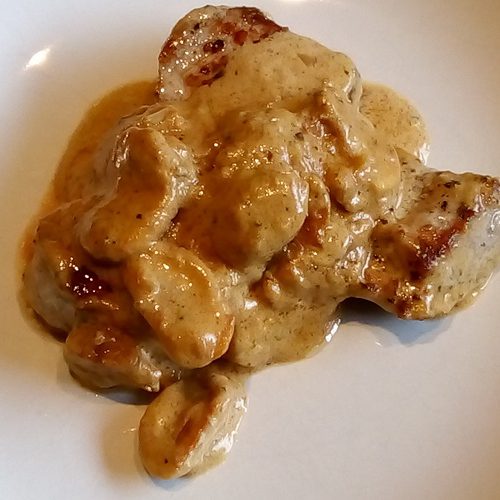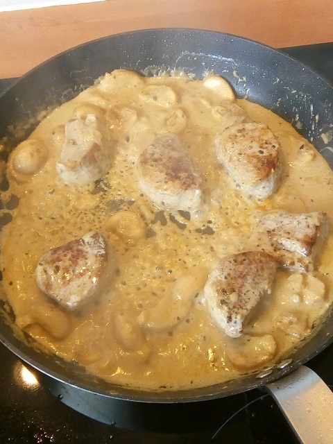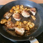 Voeg de kookroom toe en roer het geheel goed door elkaar. Laat nog een paar minuten zachtjes koken. Verdeel de medaillons met de champignonsaus over de borden. Serveer er een garnituur bij naar keuze. Hier waren dat aardappelkroketjes uit de oven.