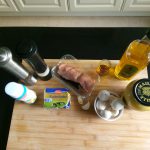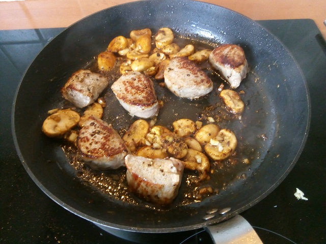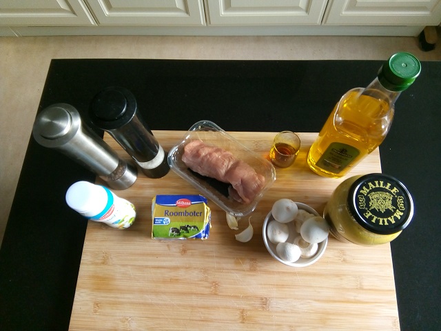 Zet alle ingrediënten klaar. Pel en snipper de knoflook. Maak de champignons schoon met een velletje keukenpapier. Snijd het onderste stukje van het steeltje eraf. Snijd de champignons in plakjes. Snijd de varkenshaas in medaillons van ongeveer 2,5 cm. dik.