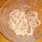 3. Meng in een kom de varkensreepjes, eidooier, maizena en 1 kl 4 kruidenpoeder. Schep dit goed door elkaar en laat een half uur marineren.