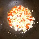 5. Giet nog een beetje olie in de pan en fruit de ui, knoflook, paprika en gember. Zodra de ui glazig is voeg dan de varkensreepjes weer toe aan de pan. Zet het vuur lager. Giet er de sojasaus bij en wat chilipoeder. Voeg de azijn toe. Roer goed door elkaar en laat een paar minuten stoven. .