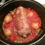 Doe de spekblokjes in dezelfde pan samen met de ui. Fruit aan totdat de ui glazig is. Voeg dan de aardappelen, knoflook en wat provencaalse kruiden toe. Doe de rollade terug in de pan. Schenk de azijn in de pan. Voeg de tomatenblokjes, de rode peper, de blaadjes van de takjes tijm toe. Breng het geheel aan de kook.