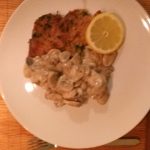Verdeel de schnitzels met de champignons over de borden en garneer met een schijf citroen.