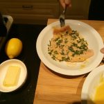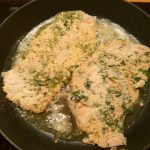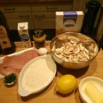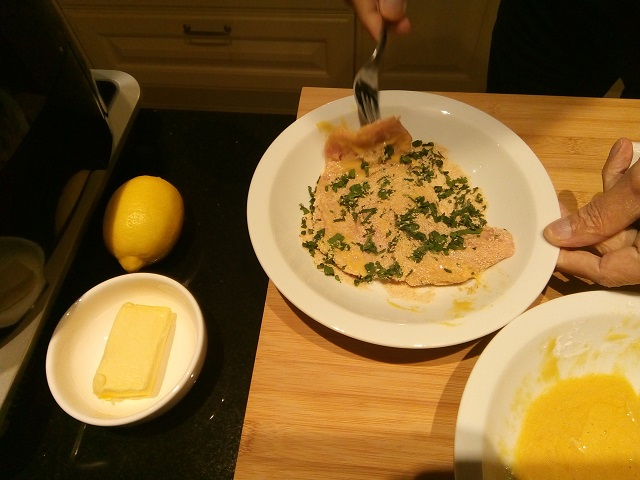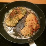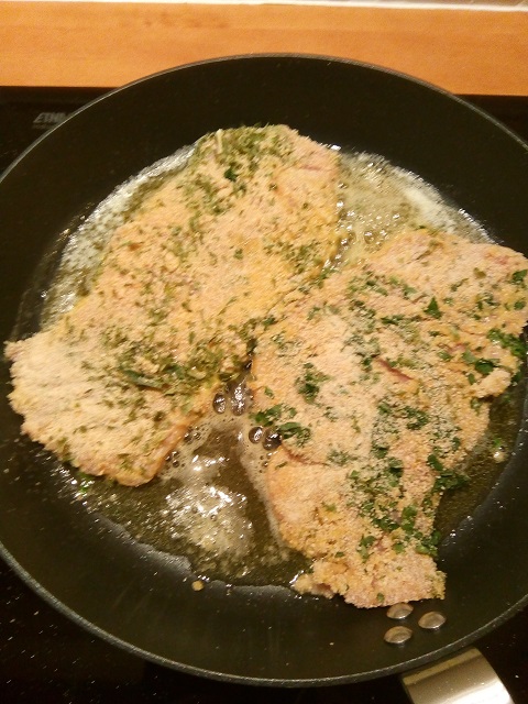 De schnitzels zijn nu mooi aan beide zijden gepanneerd. Zet een koekenpan op middenoog vuur met 20 gr. boter en een scheutje olijfolie.
