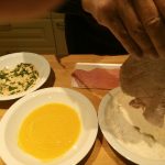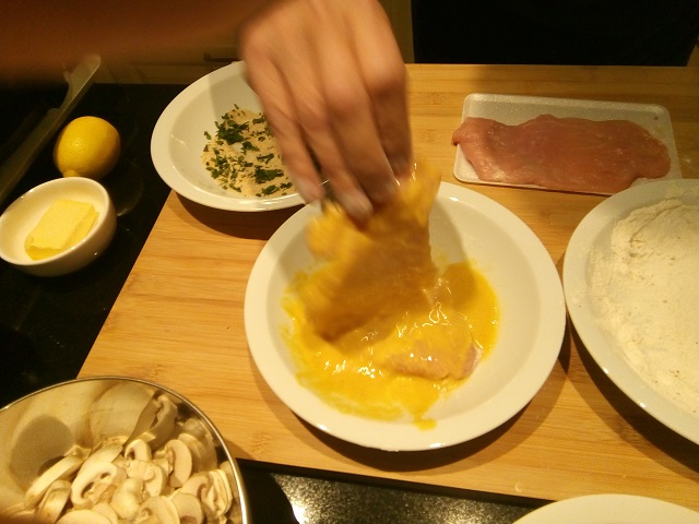 Haal dan de schnitzels door het eimengsel. Strijk het teveel aan ei eraf.