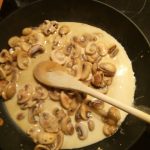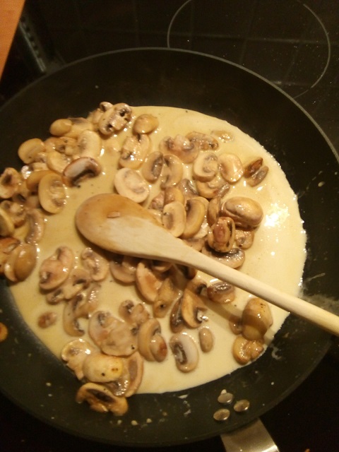 Verhit in een andere koekenpan de rest van de boter en bak daarin de champignons. Verkruimel het bouillonblokje over de champignons. Als deze mooi aangebakken zijn voeg dan de kookroom toe. Meng goed door elkaar. Maak een papje van wat maizena en water en voeg dat beetje bij beetje toe om een wat dikkere saus te krijgen.