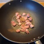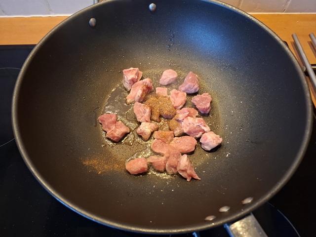 1. Zet een wok op middelhoog vuur met 1 el. olie. Bak de stukjes vlees om en om met de maïzena. Voeg een beetje zout, vierkruidenpoeder en peper toe. Haal het vlees uit de wok en bewaar op een bordje.