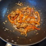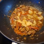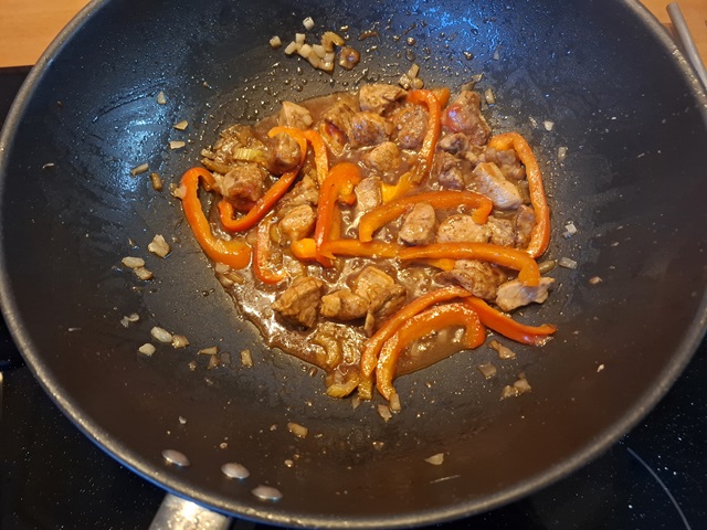 3. Voeg het vlees terug in de wok samen met de sojasaus, rietsuiker, ketchup, kippenbouillon en rijstazijn. Laat 10 minuten zachtjes stoven.
