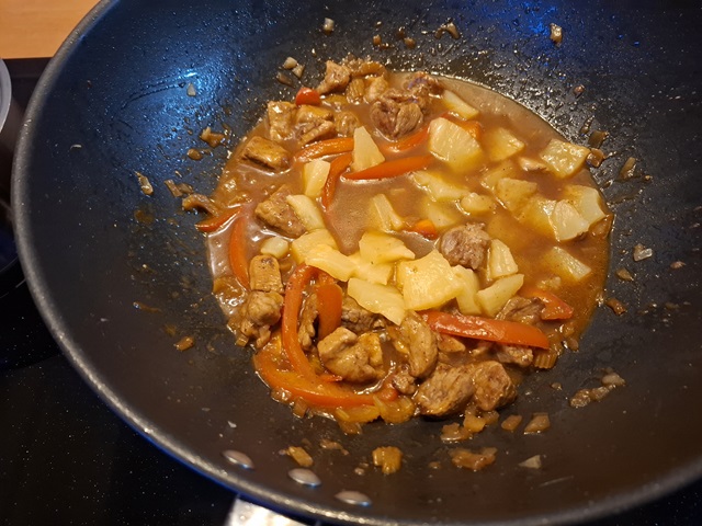 5. Voeg de ananas toe, 5 cl van het ananassap en de mirin. Kook nog 5 minuten. Roer het geheel goed door.