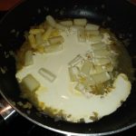 2. Verhit de olijfolie een een ruime koekenpan en fruit de ui tot deze glazig ziet. Voeg de knoflook toe en bak deze een halve minuut mee. Voeg de asperges toe. Blus af met de witte wijn.