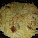 3. Voeg de kookroom toe. Breng aan de kook en en leg er de stukjes zalm in.