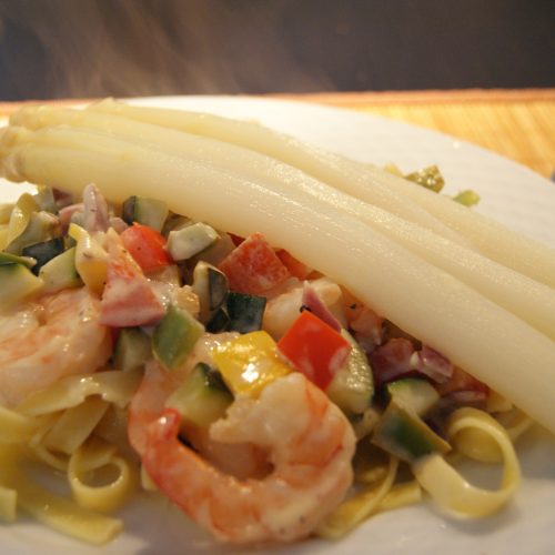 Haal de asperges met een schuimspaan voorzichtig uit de pan en serveer de asperges op de pasta.