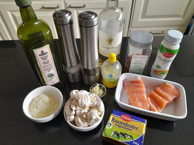 Zet alle ingrediënten klaar. Maak de champignons schoon met een stukje keukenpapier. Snijd een stukje van het steeltje en snipper in plakjes. Pel en snipper de knoflook.