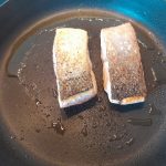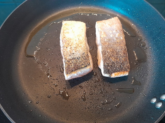 Verhit in een koekenpan 1 el. olie en bak de zalm. Eerst met de huiszijde naar beneden gedurende 6 minuten. Keer dan om, bestrooi met zout en peper en bak de andere zijde 4 minuten. Heb je zalm zonder vel dan is de baktijd 4 minuten per zijde. Haal uit de pan en bewaar op een bordje en dek af met aluminiumfolie.