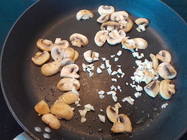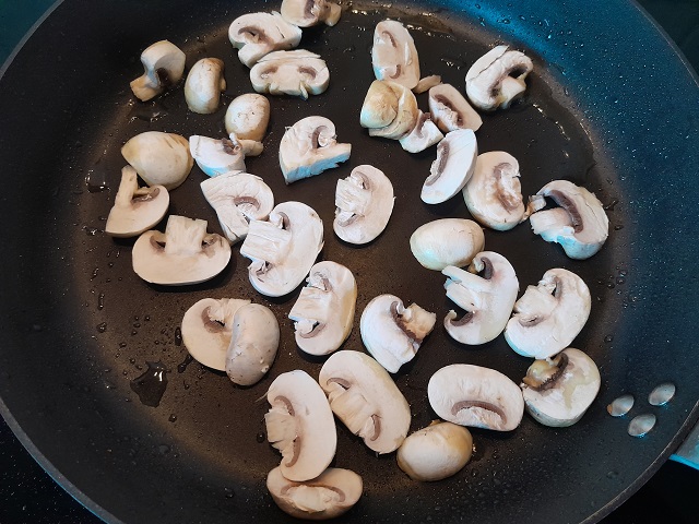 Verhit de andere el. olie in de pan en bak de champignons ongeveer 4 minuten of tot ze wat zachter beginnen te worden. Roer regelmatig door.