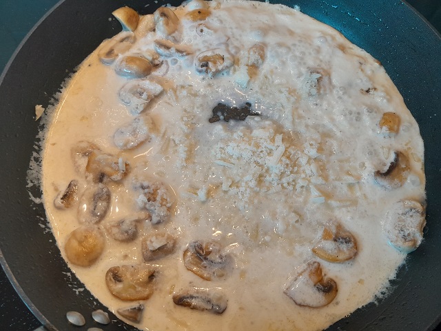 Voeg de kookroom, wijn (of kippenbouillon), citroensap en Parmezaanse kaas toe en laat 3 minuten zachtjes koken, zodat de saus wat indikt en de kaas kan smelten.