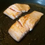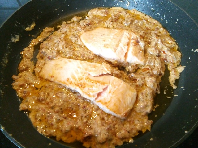 Voeg de zalmmoten toe om deze nog even door te warmen.