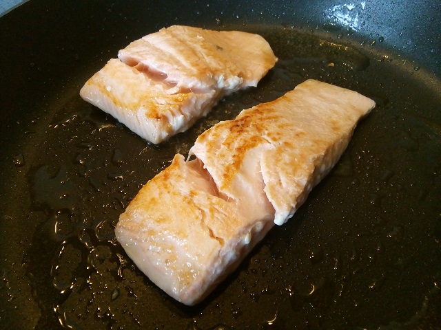 Verhit de olijfolie in een pan op middelhoog vuur. Bak de zalm aan beide zijde tot hij net gaar is. Haal dan de zalm uit pan en bewaar op een bordje.