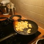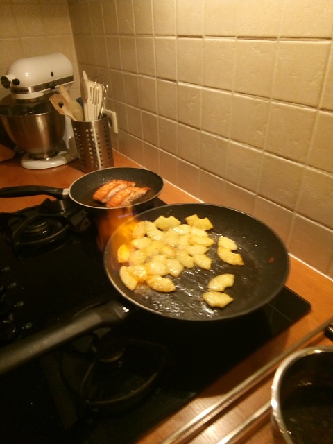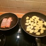 3. Zet een koekenpan op met een klontje boter en bak de stukjes ananas om en om tot ze beginnen te kleuren. Zet nog een koekenpan op met een scheutje olie en bak de zalm rustig aan beiden kanten. Strooi wat zout en peper over de zalmmoten