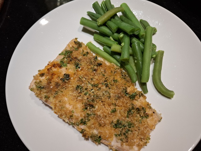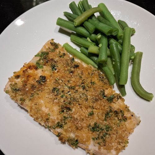 Verdeel het Parmezaan mengsel gelijkmatig over de zalmmoten en druk licht aan.