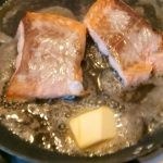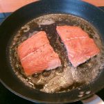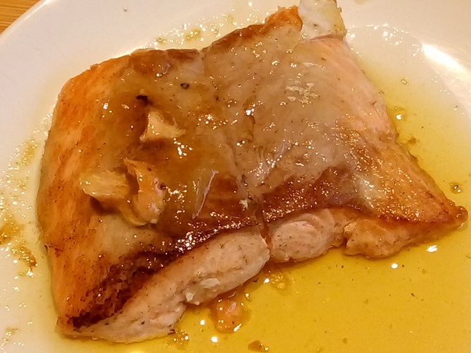 Bak de zalm aan beide zijden zo'n 3 à 4 minuten. Heeft de zalm nog een huid bak dan de huidzijde 1 minuut langer. Voeg de rest van de boter toe en laat deze smelten. Voeg dan de saus toe tussen de moten zalm. Laat zo'n 30 seconden inkoken. Neem de pan van het vuur om verbranden te voorkomen. Draai de zalm nog een keer om en lepel de saus over de moten zalm. Verdeel over de zalm. Zet extra citroensap op tafel zodat een ieder nog wat extra citroen kan toevoegen. Niet elke honing is even zoet. Wij aten er broccoli en gekookte aardappelen bij.