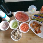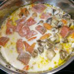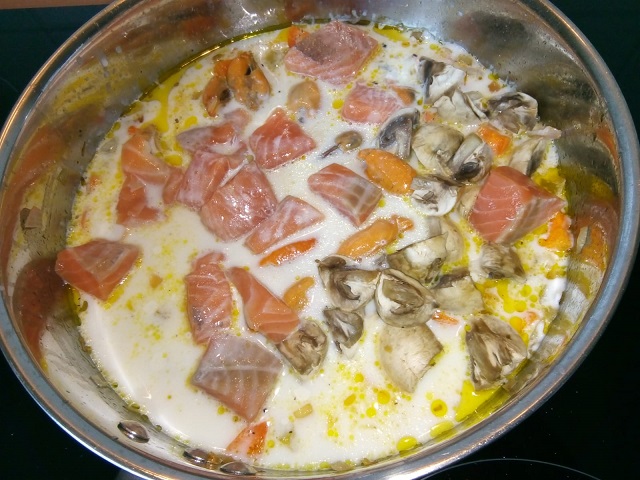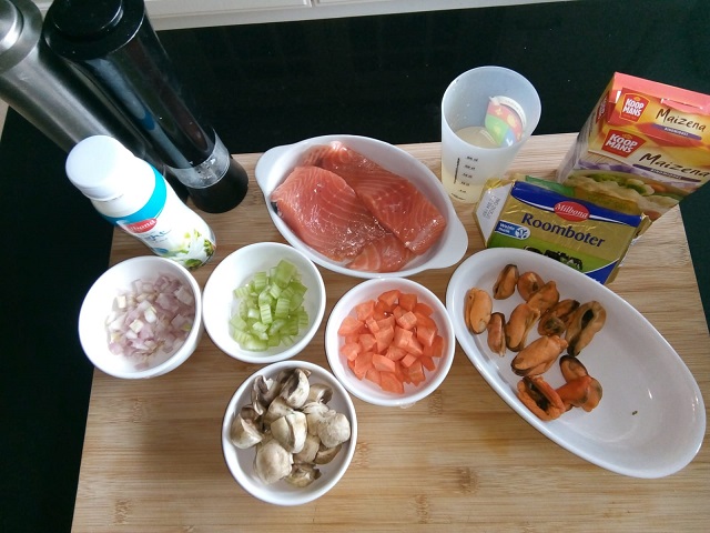 Zet alle ingrediënten klaar. Pel en snipper de sjalot. Schil de worten en snijd in kleine blokjes. Schil de bleekselderij en snijd in blokjes. Laat de zeevruchten en de mosselen ontdooien ontdooien. Snij de zalm in blokjes. Verwijder de (eventuele) vellen van de zalm. Snijd de zalm in blokjes.