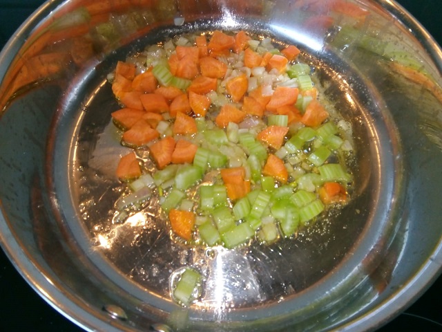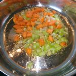 Verwarm de boter in een hapjes pan en fruit de sjalot met de wortel en de selderij. Voeg wat zout en peper toe en voeg de witte wijn toe. Laat dit gedurende een minuut of 10 zachtjes koken.