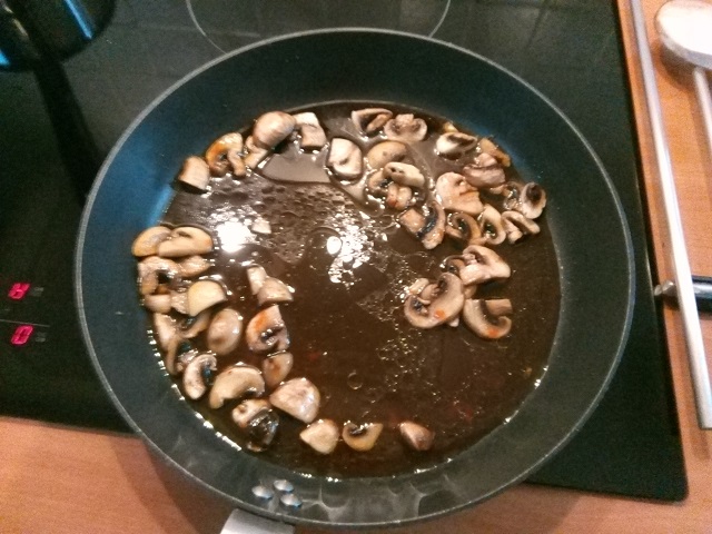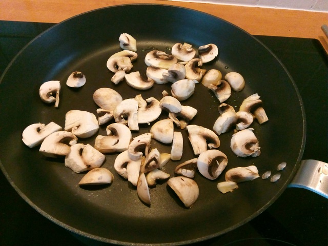 Verhit de olijfolie in een koekenpan en bak de champignons.