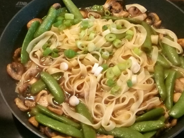 Voeg de sugar snaps de afgegoten pasta bij het champignon mengsel. Verwarm het geheel.