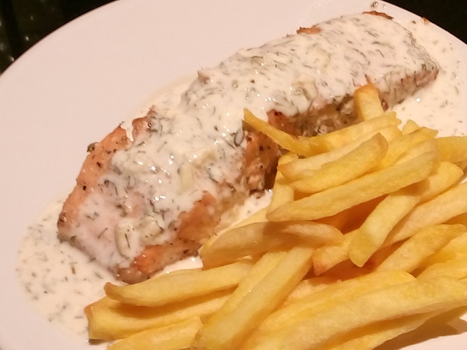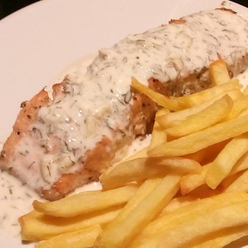 Verdeel de zalm over de borden en schenk er wat van de saus over.