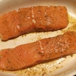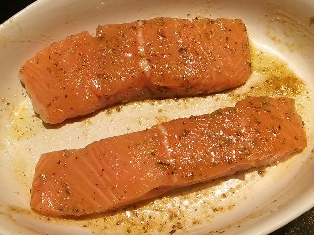 Wentel de zalm door het mengsel. Zet de ovenschaal in de oven en bak gedurende 12-15 minuten, afhankelijk van de dikte van de zalm.