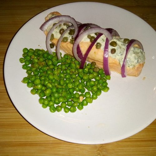 5. Maak de borden op. Leg een moot zalm op het bord. Bedek deze met een lepel peterselie-mayonaise en leg hier een paar uienringen en wat kapertjes op. Verdeel de doperwten over de borden naast de zalm.
