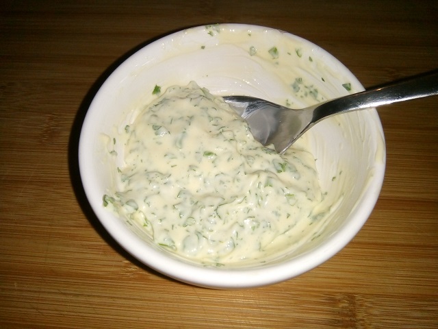 4. Meng intussen de mayonaise met de peterselie en voeg een klein beetje zout en peper toe.