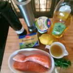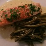 6. Verdeel een klein beetje saus over de borden. Leg hierop de zalm en giet nog een beetje saus over de zalm. Decoreer met wat peterselie.