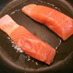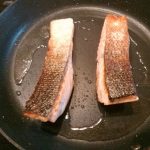 4. Verhit in een koekenpan de rest van de olijfolie en bak de zalm eerst 5 a 6 minuten op de huidkant.