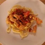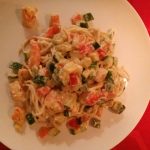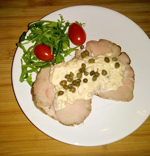 Snijd het pakket in stukken en verdeel over de borden samen met de krieltjes.