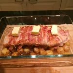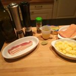 Schep de krieltjes uit de pan in een ovemschaal. Leg daar het zalmpakket op. Leg daar de overige boter op in blokjes en schuif in de oven. Bak het geheel in 10 minuten.