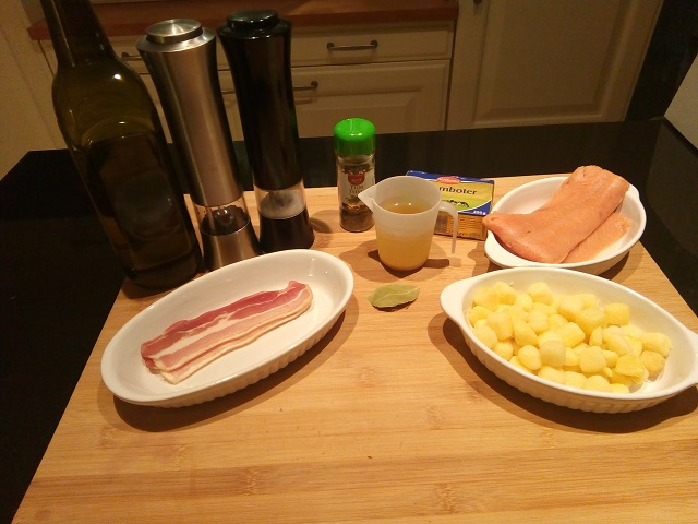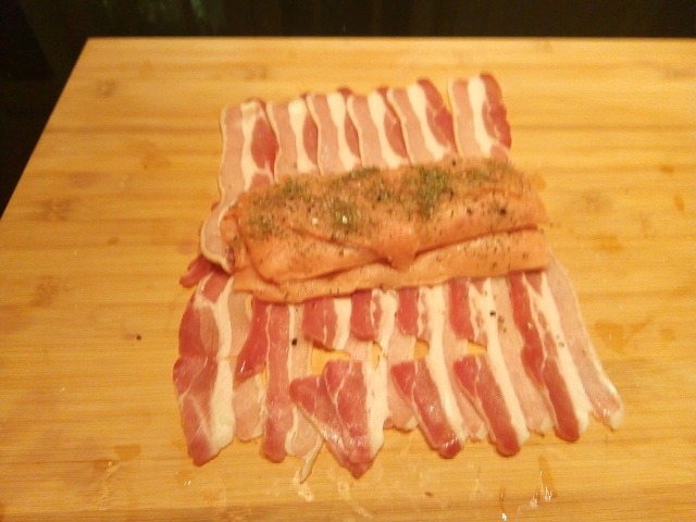 Leg de spekreepjes op je werkblad. Twee reepjes in elkaars verlengde en elkaar net overlapend. Leg daar de moot zalm op en bestrooi met 1 tl tijm, zout en peper.