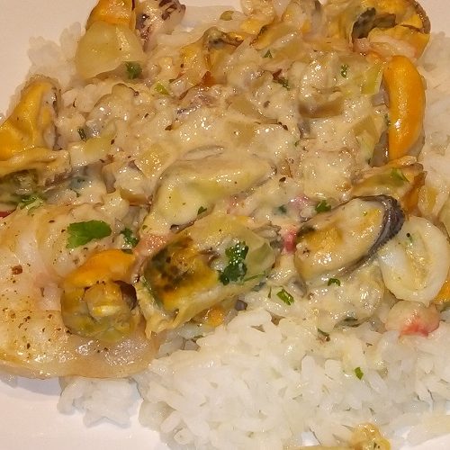 Verdeel de rijst over de borden en schep de zeevruchten met saus erover.