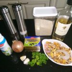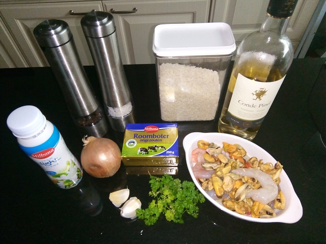 Haal de diepvriesprodukten 2 uur voor gebruik uit de vriezer en laat ze ontdooen. Zet alle ingrediënten klaar. Pel en snipper de ui en de knoflok. Snijd de peterselie fijn.