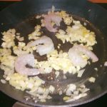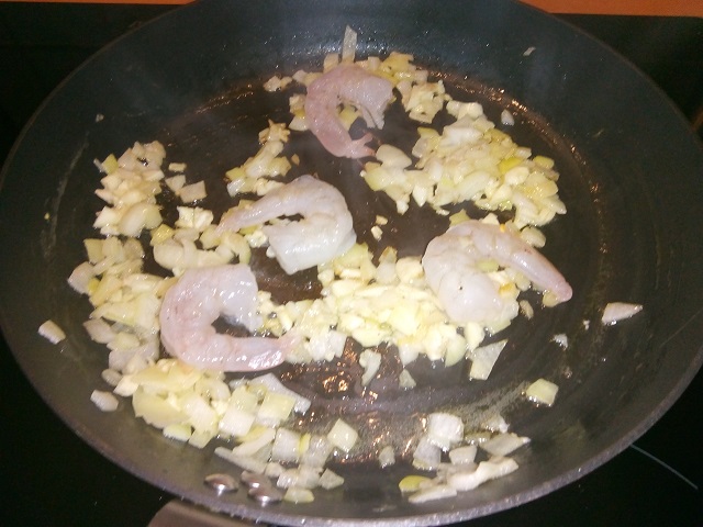 Verhit in een koekenpan op middenhoog vuur de boter. Fruit de ui tot deze glazig. Bak de grote garnalen aan beide zijden gedurende een minuut of 2 per zijde. Voeg dan de knoflook toe. Laat een minuutje meenakken. Kook ondertussen de rijst volgens aanwijzingen op de verpakking in gezouten water.