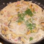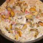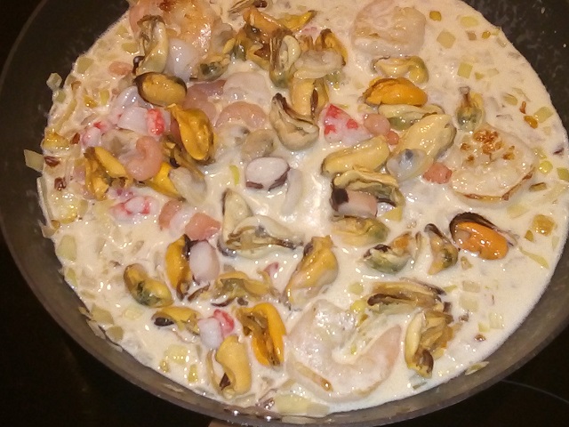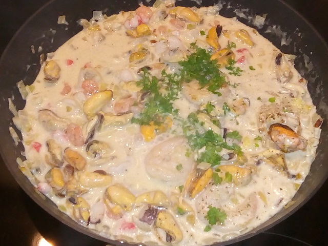 Voeg de mosselen en zeevruchten toe en laat deze goed doorwarmen.