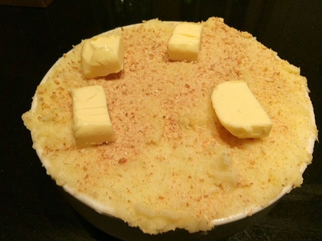 Leg de helft van de aardappelpuree op de bodem van de ovenschaal. Bedek deze met de zuurkool en dan het gehakt. Verdeel de ananas over de schotel. Eindig met de rest van de aardappelpuree. Strooi ruim de paneermeel over de ovenschotel en leg er een paar boterklontjes op.