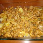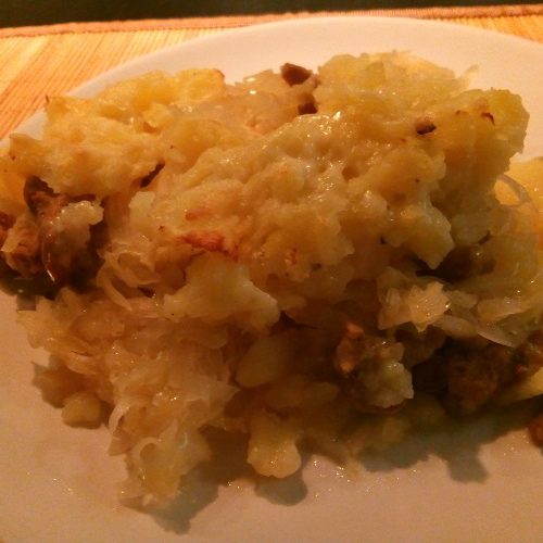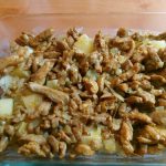 Vet ondertussen een ovenschaal in met wat boter. Laat de zuurkool uitlekken en verdeel over de bodem van de ovenschaal. Verdeel de ananasblokjes over de zuurkool. Bewaar het sap. Verdeel het shoarma-ui-knoflookmengsel over de zuurkool in de ovenschaal.
