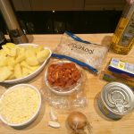 Pel en snipper de ui en knoflook. Schil de aardappels en snijd ze in blokjes. Zet de aardappelen op en kook ze een minuut of 18 tot ze stampbaar zijn.