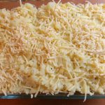 Bedek het geheel met de geraspte kaas en zet de schaal in de oven en laat deze een minuut of 25 bakken. Let op dat de kaas niet verbrandt, dek zo nodig af met een stuk aluminiumfolie.