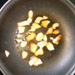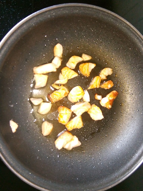 Bak de zalm in wat olijfolie en bestrooi met zout en peper. Haal de blokjes uit de pan en laat afkoelen op een bord.