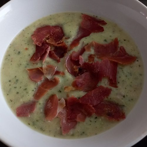 Pureer de soep. Verdeel de soep over kommen en breek de ham in stukjes en verdeel over de kommen.