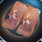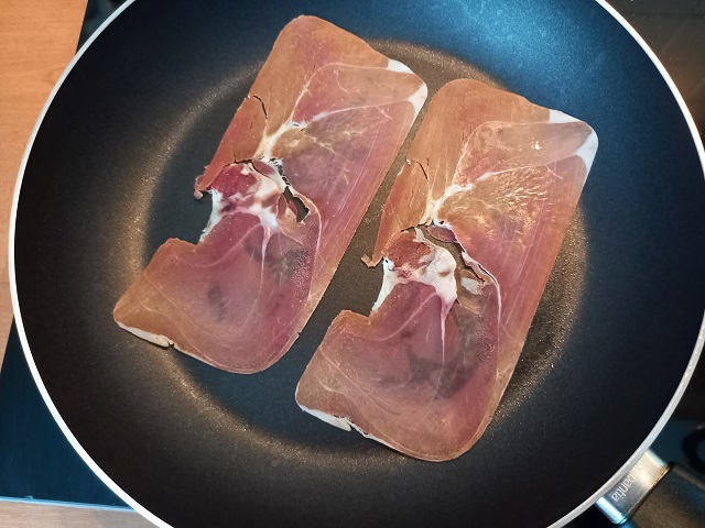 Bak in een droge koekenpan de plakken ham tot ze knapperig zijn.